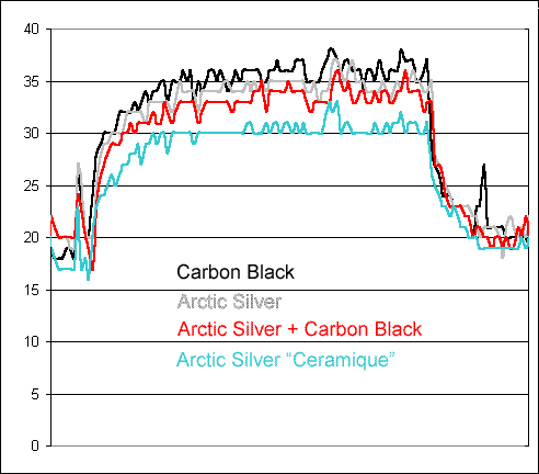 Overall, the results are extremely similar, however, Carbon Black still resulted in the highest temperatures, followed by Arctic Silver (original). AS is highly viscous and diluting it in a 1:2 fashion with Carbon Black improved the performance of both compounds. Arctic Silver "Ceramique" gave the overall best results.